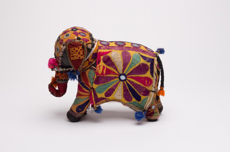 Stuffed textile patchwork elephant with embroidery to the body, made in Nepal. The maker is unknown.