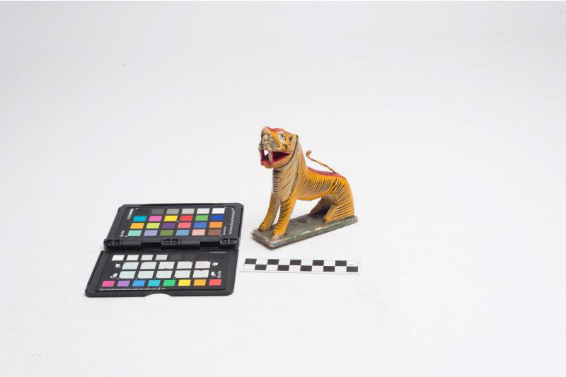 Decorative tiger on stand. The tiger is in a seated position; its mouth is open revealing its teeth and tongue. It has been painted to represent striped fur. It has a wire tail.