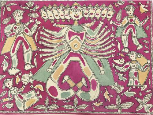 Ink and watercolour print. The print depicts Ravana – a Hindu demon. Ravana is shown seated with multiple arms and heads. The print was handmade in India.