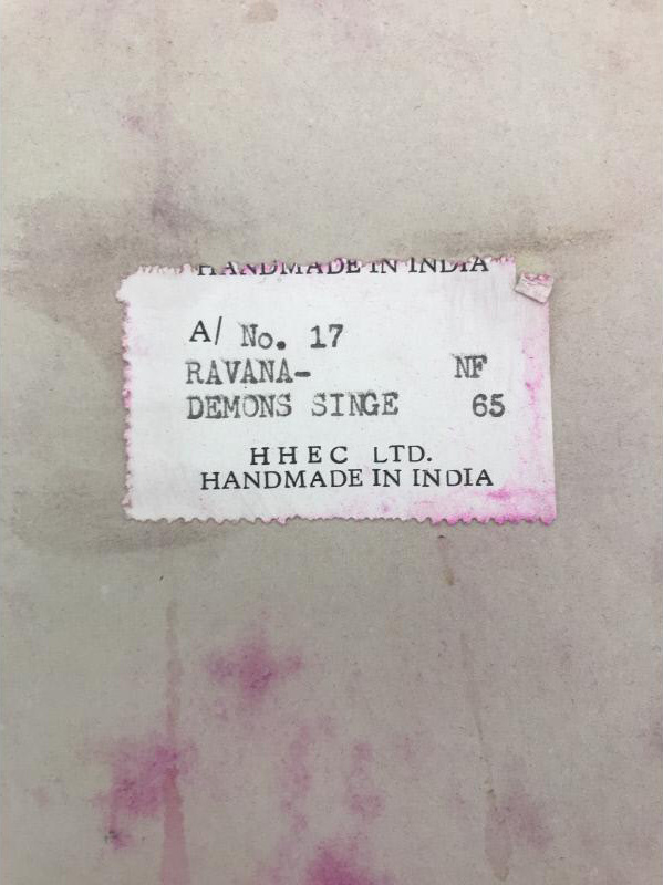 Ink and watercolour print. The print depicts Ravana – a Hindu demon. Ravana is shown seated with multiple arms and heads. The print was handmade in India.