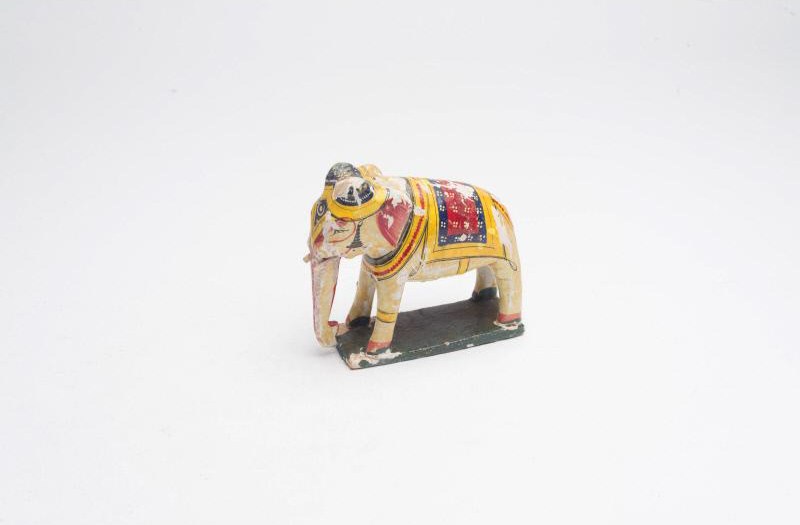 Decorative elephant on stand. The elephant has been painted to represent festival garments including a headdress, beaded ornamentation and a blanket. Its tusks are made of wooden dowels. Considerable loss of paint to body.