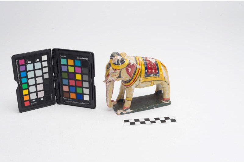 Decorative elephant on stand. The elephant has been painted to represent festival garments including a headdress, beaded ornamentation and a blanket. Its tusks are made of wooden dowels. Considerable loss of paint to body.