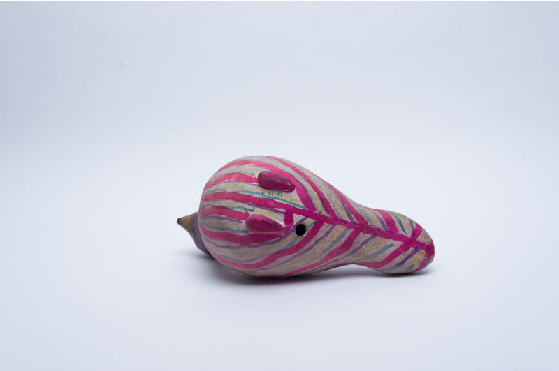 A clay animal in the shape of a bird, possibly a dove. The bird has an olive branch around its neck. The bird is painted in pink, purple, blue and gold stripes. Details such as the eyelashes and the beak are painted in gold. The bird rests on two small feet. It has a hole to the underside. Maker unknown.