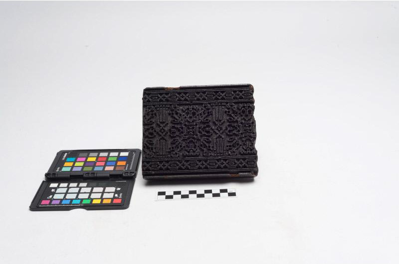 Hand carved wooden block for printing. The hand block has a fine geometric pattern with a border to the top and bottom. There is a handle to the reverse. There are 5 hollow tunnels running the length of the hand block. Possibly Indian. The maker is unknown.