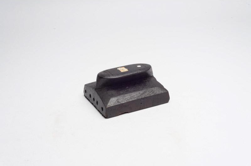 Hand carved wooden block for printing. The hand block has a fine geometric pattern with a border to the top and bottom. There is a handle to the reverse. There are 5 hollow tunnels running the length of the hand block. Possibly Indian. The maker is unknown.